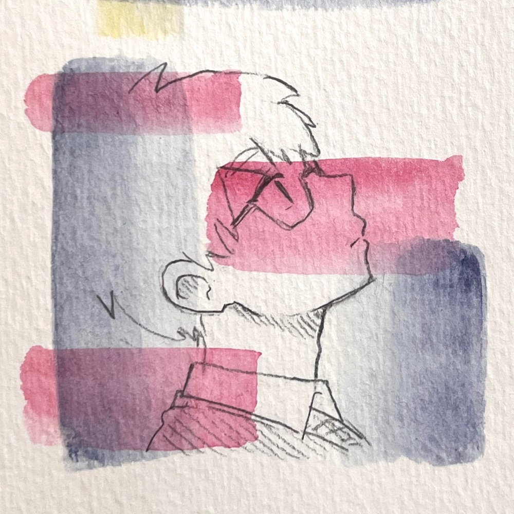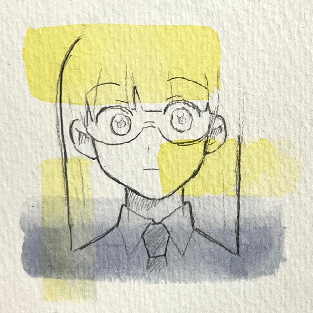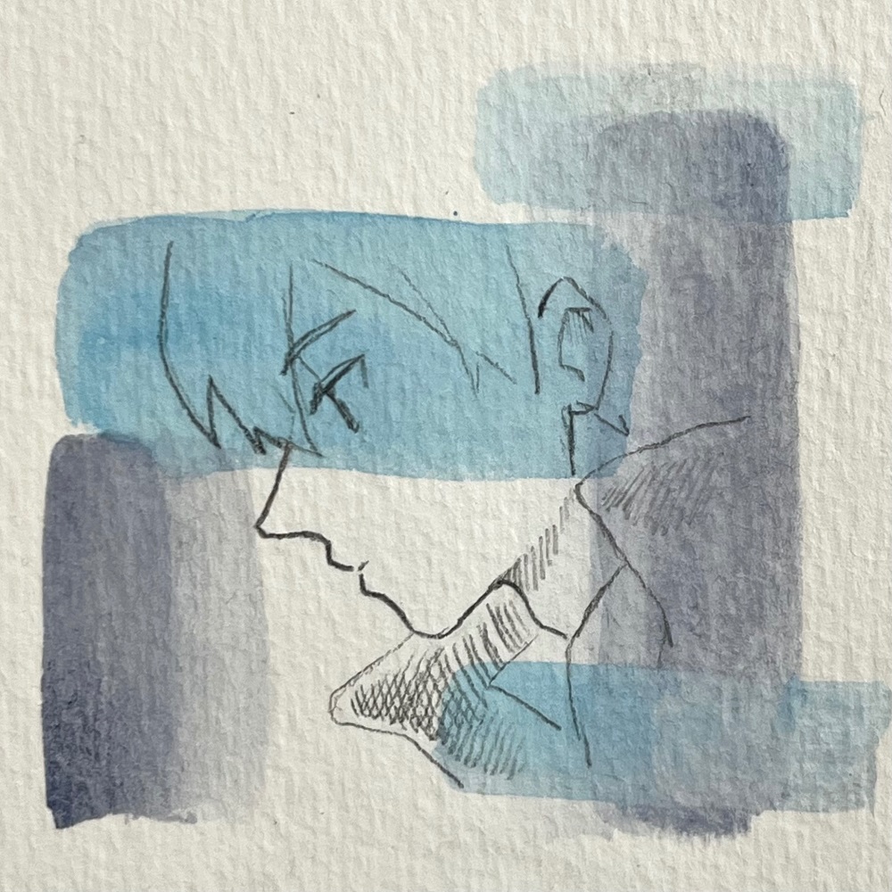 水彩の練習のために描いたイラスト。一学期の迅・エミリー・翔太。迅はトラックを、エミリーは迅を、翔太は星空を見ている。互いの視線がかち合うのは、まだ先の話。
